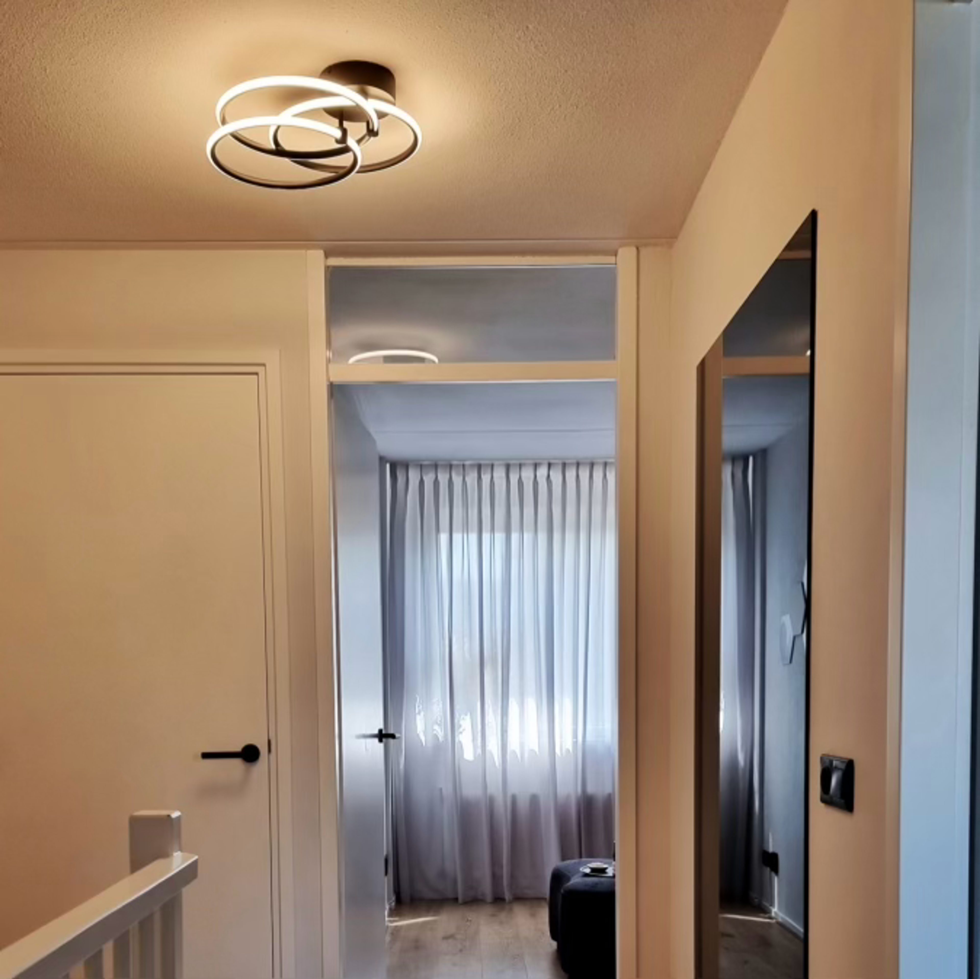 Deze overloop wordt meteen sfeervol dankzij de moderne plafondlamp met een uniek design